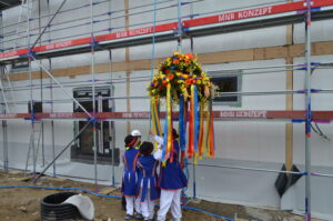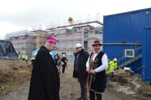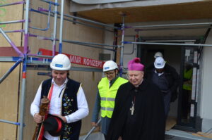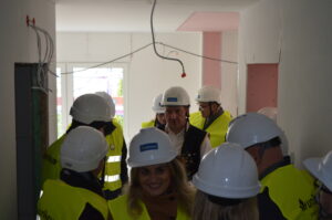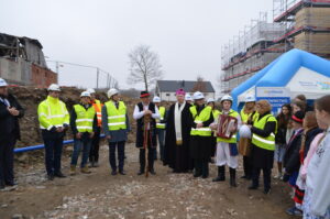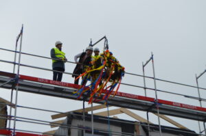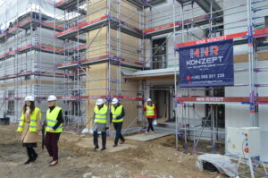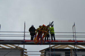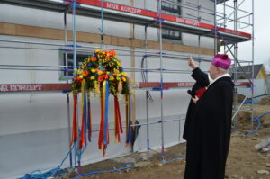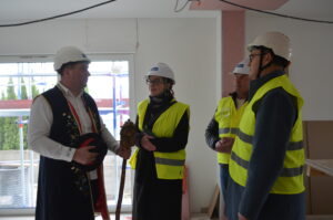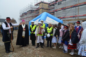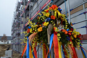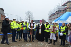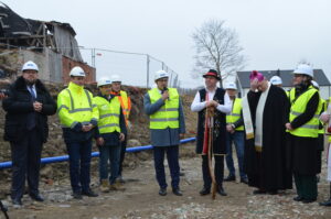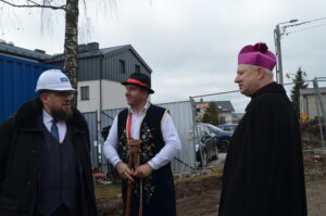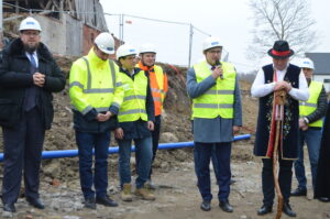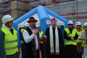Inwestycja SIM KZN-Kaszuby przy ul. Królewskiej 2a w Kielnie osiągnęła kolejny etap, czego symbolem stała się tradycyjna wiecha, która 20 marca zawisła na szczycie nowoczesnego budynku. Realizacja projektu w ekspresowym tempie, z wykorzystaniem zaawansowanej technologii modułowej 3D, stanowi wymierny dowód na skuteczność i operacyjność Spółki w odpowiedzi na lokalne potrzeby mieszkaniowe. Uroczystość uświetniła obecność ks. bp. Wiesława Szlachetki, który poświęcił inwestycję, oraz posłanek: Wiolety Tomczak i Henryki Krzywonos-Strycharskiej. Kluczowym momentem było wspólne zamocowanie wieńca przez Wójta Ryszarda Kalkowskiego, Prezesa Jarosława Szydłaka oraz Emila Rojka – Wicewojewodę Pomorskiego i jednocześnie Członka Rady Nadzorczej KZN, co podkreśliło silne wsparcie administracji rządowej dla naszych działań. Wydarzenie zyskało wyjątkową oprawę dzięki dzieciom w strojach regionalnych i dźwiękom akordeonu, co idealnie wpisało się w trwający Tydzień Jedności Kaszubów. Po oficjalnej części goście wizytowali wnętrza powstających 18 lokali, doceniając wysoką jakość wykonania oraz tempo prac prowadzonych przez zespół SIM. Ta inwestycja to modelowy przykład synergii między KZN, samorządem a Spółką, wyznaczający nowe standardy w budownictwie społecznym.